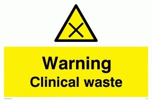 Clinical wastes require warning signs and the convention is an internationally recognised biohazard sign in a yellow triangle, generally supplemented with an appropriate written description.